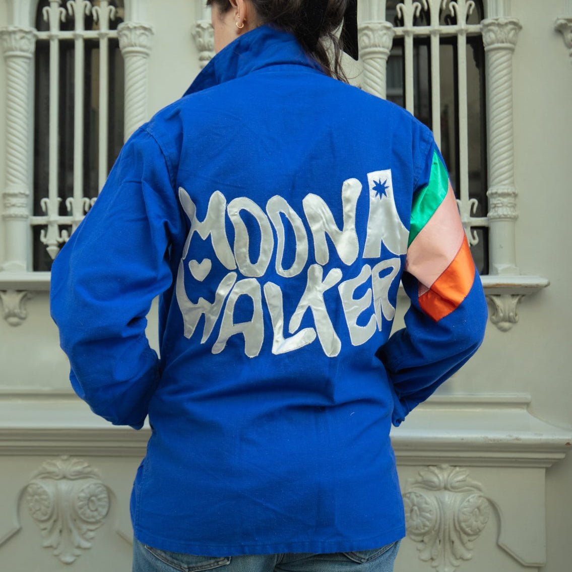 A timeless jacket in deep blue, adorned with exclusive Moon embroidery on the back.